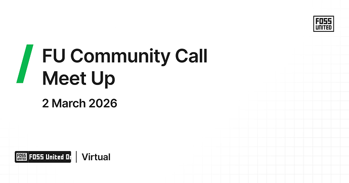 Community Calls are coming back in 2026 after a significant break in 2025. It’d be great if the Community picks up the responsibility of scheduling, running, and reporting on the Community Calls, but until we get there, at least one member of the FOSS United Foundation Staff will be present in the calls and we’ll also try to ensure that at least one member of the Governing Board will be present in the calls (cc @Bodhish_Thomas , @Bowrna_Prabhakaran , @Nemo , @Shree_Kumar , @Swastik_Baranwal ).